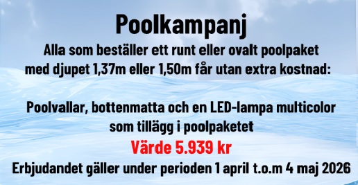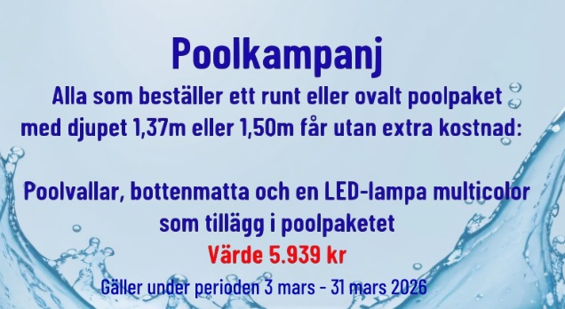I över 25 år har vi varit en aktör på svenska poolmarknaden och vi har lärt oss att våra, över 30 000 kunder uppskattar när allt går smidigt. Därför har alltid vårt mål varit att leverera kompletta swimmingpoolpaket. Vi vågar nästan misstänka att vi har marknadens mest kompletta och prisvärda poolpaket, oavsett vilken swimmingpool du väljer att köpa. Alla våra pooler (höjd 1,07 t.o.m 1,37) är självbärande och kan stå fritt på marken och i vissa fall kan man välja att gräva ner poolen helt eller delvis. Dessutom finns alltid möjligheten att bygga in swimmingpoolen i sitt trädäck, vilket många av våra kunder väljer att göra.